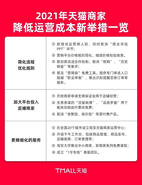 天貓方面透露,整個2021年,天貓都將持續(xù)簡化流程、優(yōu)化規(guī)則,為商家降本增效。