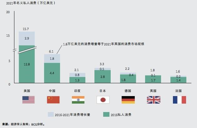 根據(jù)經(jīng)濟學人智庫(EIU)的數(shù)據(jù)和波士頓咨詢公司(BCG)的分析,2016-2021年中國的消費增長量達1.8萬億美元,預計到2021年,中國消費市場仍將擴大近一半,達到6.1萬億美元的規(guī)模。