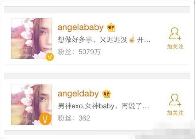 以angelababy為例,頭像完全一致,甚至頭像上的認(rèn)證V也P上了,昵稱只改動少許,乍一看,還真分不出來哪個是真。當(dāng)然這些高仿號可能是出于對偶像的熱愛,情不自禁,控幾不住我記幾。