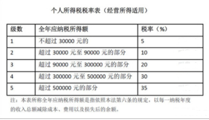 2.個人所得稅(經(jīng)營所得),按超額累進(jìn)稅率征收,就是年底收入總額減除成本,費(fèi)用和損失后的余額,按照下表繳納個人所得稅(經(jīng)營所得):