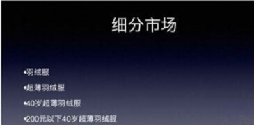 假如選擇了超薄羽絨服,其實還是很大,那就在超薄款羽絨服里再進行特定年齡細分,比如說40歲超薄羽絨服;也可以在超薄羽絨服里進行價格細分,比如200元以下超薄羽絨服。